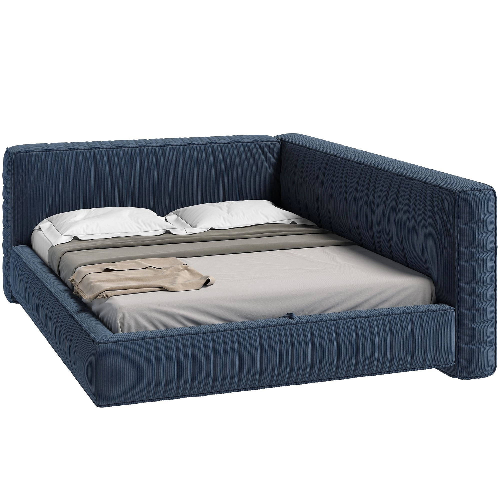 Конструкция с мягкими объемными бортами легко интегрируется в угловую часть небольшого пространства, задействуя всю полезную площадь. А разместив кровать в центре большой комнаты, вы сделайте ее настоящим арт-объектом в яркой и необычной интерьерной композиции. Мягкие объемные изголовья и борта с декоративными складками создают ощущение погружения в мягкость, расслабляя после тяжелого дня. Ортопедическое основание на металлическом каркасе с ламелями из натурального дерева обеспечит надежную поддержку для качественного и здорового сна. А уборка будет простой и быстрой – царги находятся на высоте 15 см от пола.